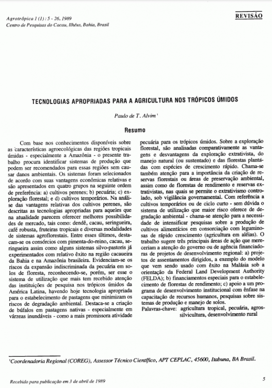 Recursos continuadoIdioma: (Pt) Outro título: - Appropriate technology for agriculture in the humid tropics