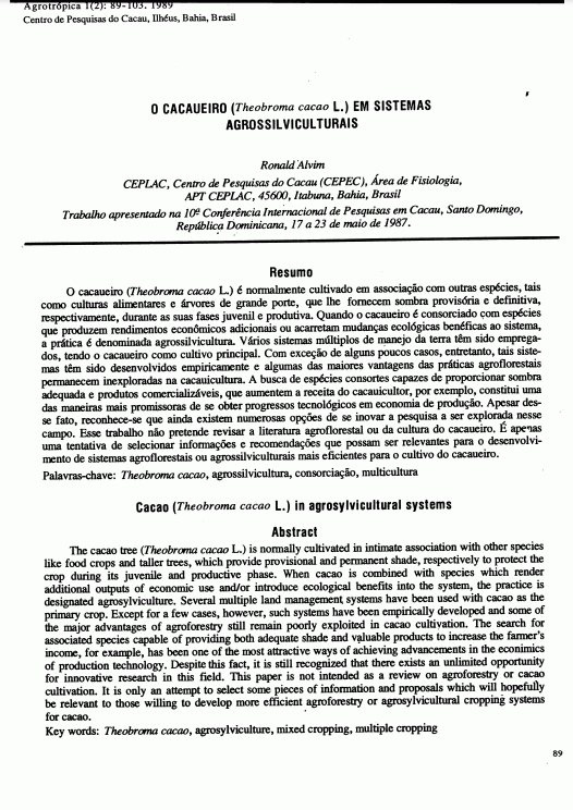 Recursos continuadoIdioma: (Pt) Outro título: - Cacao (Theobroma cacao L.)in agrosylvicultural systems