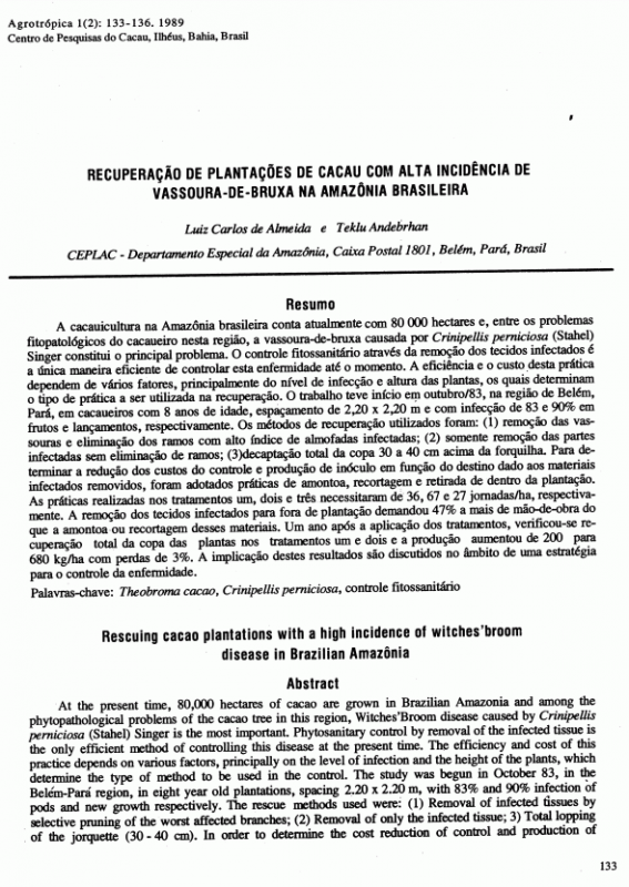 Recursos continuadoIdioma: (Pt) Outro título: - Rescuing cacao plantations with a high incidence of witches' broom disease in Brazilian Amazonia