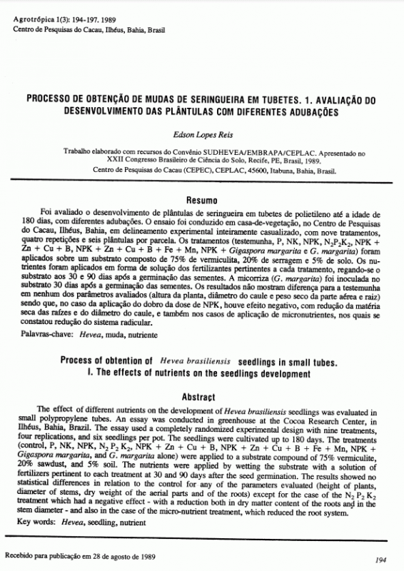 Em: Agrotropica (Brazil) (Sep-Dec 1989), v. 1(3) p. 194-197
