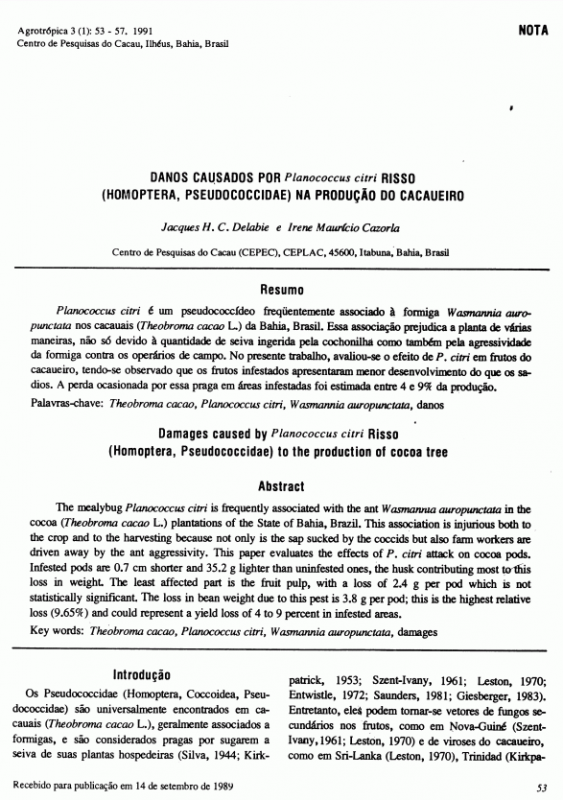 Recursos continuadoIdioma: (Pt) Outro título: - Damages caused by Planococcus citri Risso (Homoptera, Pseudococcidae)to the production of cocoa tree