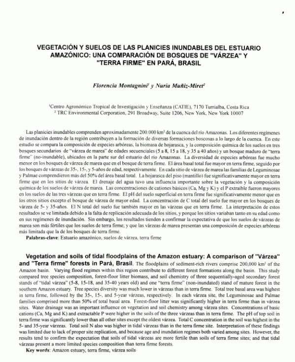 Vegetacion y suelos de las planicies inundables del estuario amazonico: una comaparacion de bosques de "varzea" y "terra firme" en Para, Brasil