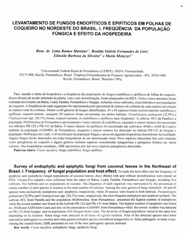 Levantamento de fungos endofiticos e epifiticos em folhas de coqueiro no nordeste do Brasil; 1: frequencia da populacao fungica e efeito da hospedeira