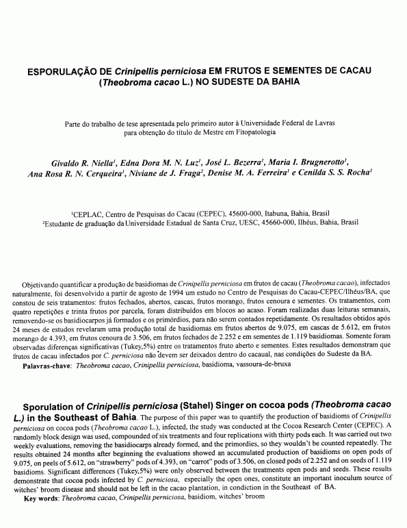 Esporulacao de Crinipellis perniciosa em frutos e sementes de cacau (Theobroma cacao L.)no sudeste da Bahia