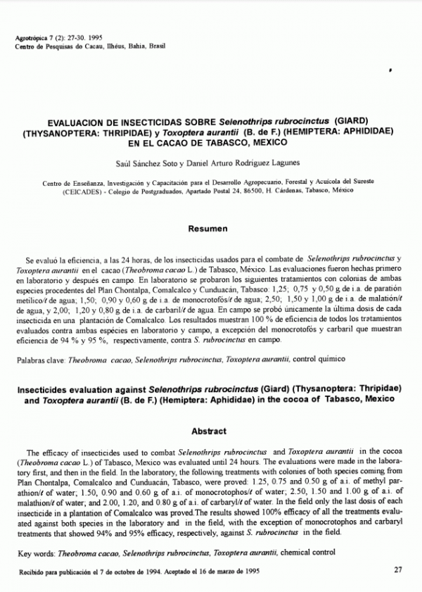 Evaluacion de insecticidas sobre Selenothrips rubrocinctus (Giard)(Thysanoptera: Thripidae)y Toxoptera aurantii (B. de F.)(Hemiptera: Aphididae)en el cacao de Tabasco, Mexico