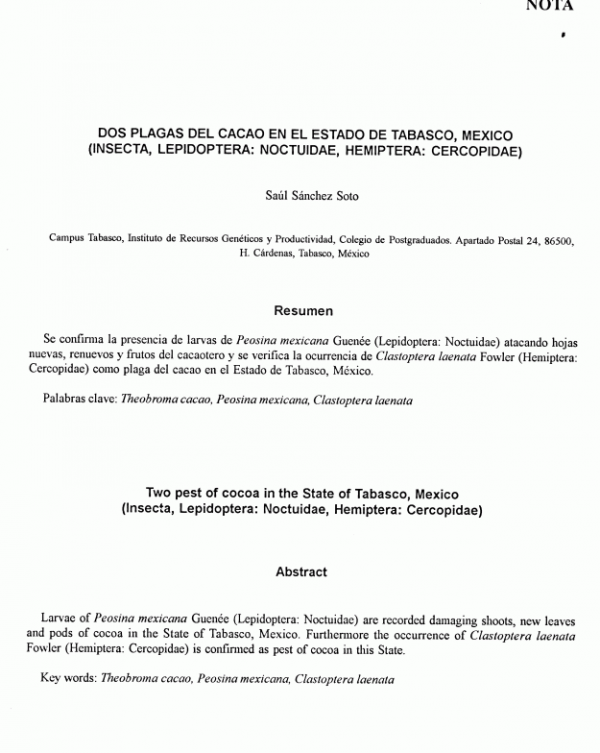 Dos plagas del cacao en el estado de Tabasco, Mexico (Insecta, Lepidoptera: Noctuidae, Hemiptera: Cercopidae)