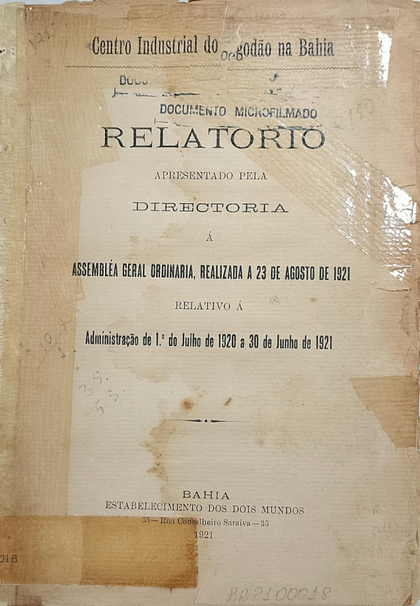 Relatorio apresentado pela directoria a assembleia geral ordinaria, realizada a 23 de agosto de 1921 relativo a administracao de 1 de julho de 1920 a 30 de junho de 1921 [Centro Industrial do Algodao na Bahia; Brasil]