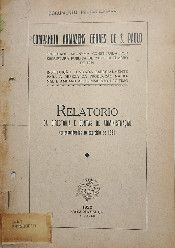 Relatorio da directoria e contas de administracao correspondentes ao exercicio de 1921 [Companhia Armazens Geraes de Sao Paulo; Brasil]