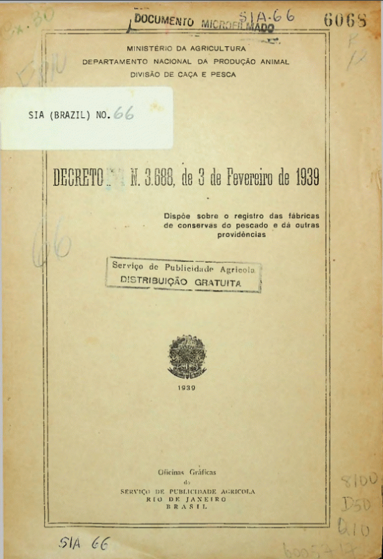 Decreto n. 3.688, de 3 de fevereiro de 1939. Dispoe sobre o registro das fabricas de conservas do pescado e da outras providencias [Brasil]