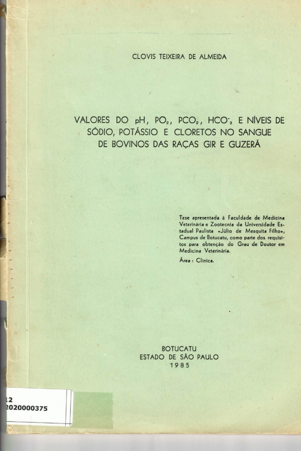 Valores do PH, PO2, PCO2, HCO-3 e níveis de sódio, potássio e cloretos no sangue de bovinos das raças Gir e Guzerá